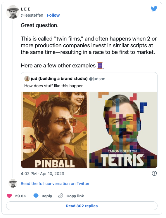 A Twitter thread on the history of "twin films" where various film studios rush to pump out films with extremely similar plotlines. I've sort of noticed this over the years, but I have no idea how it works. Corporate espionage, perhaps?