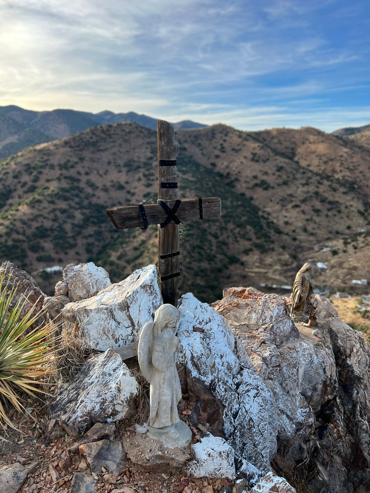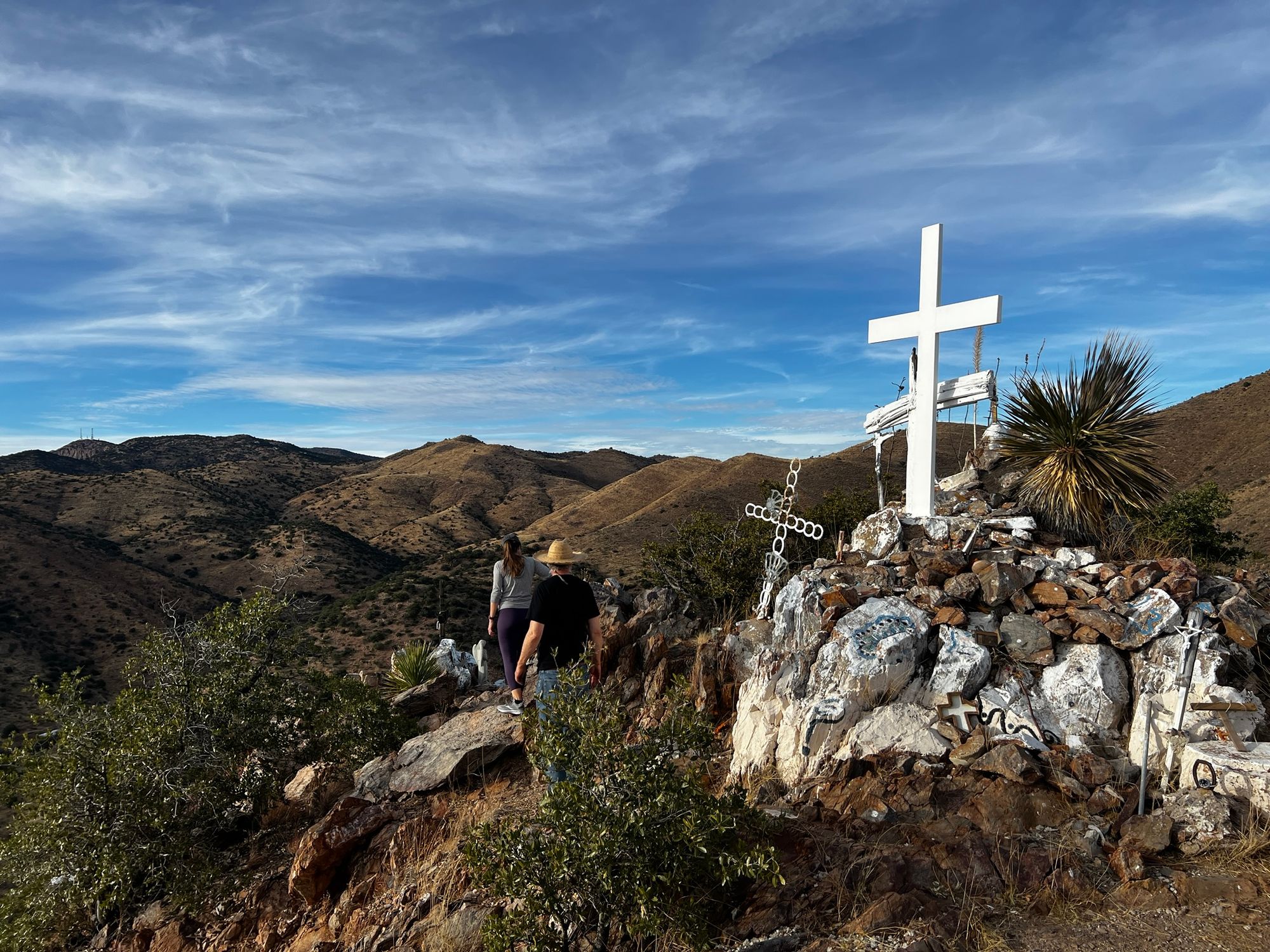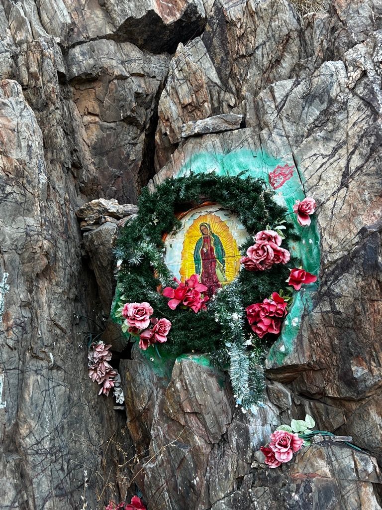 Art also maintains the Bisbee Cross Shrine, which is up on the hill behind Mike and Joanne's house. Later, Fiona, Mike and I trek to the top. Various people over the years built it up, Mike tells us. They poured immense amounts of concrete over the rock to form shelving and small grottos for various devotions. Many of the small caves in the wall are occupied by the Virgin of Guadalupe and memorials to passed relatives or pets from folks all over town. We even find a mural of Che Guevara, of whom Art is a big fan.