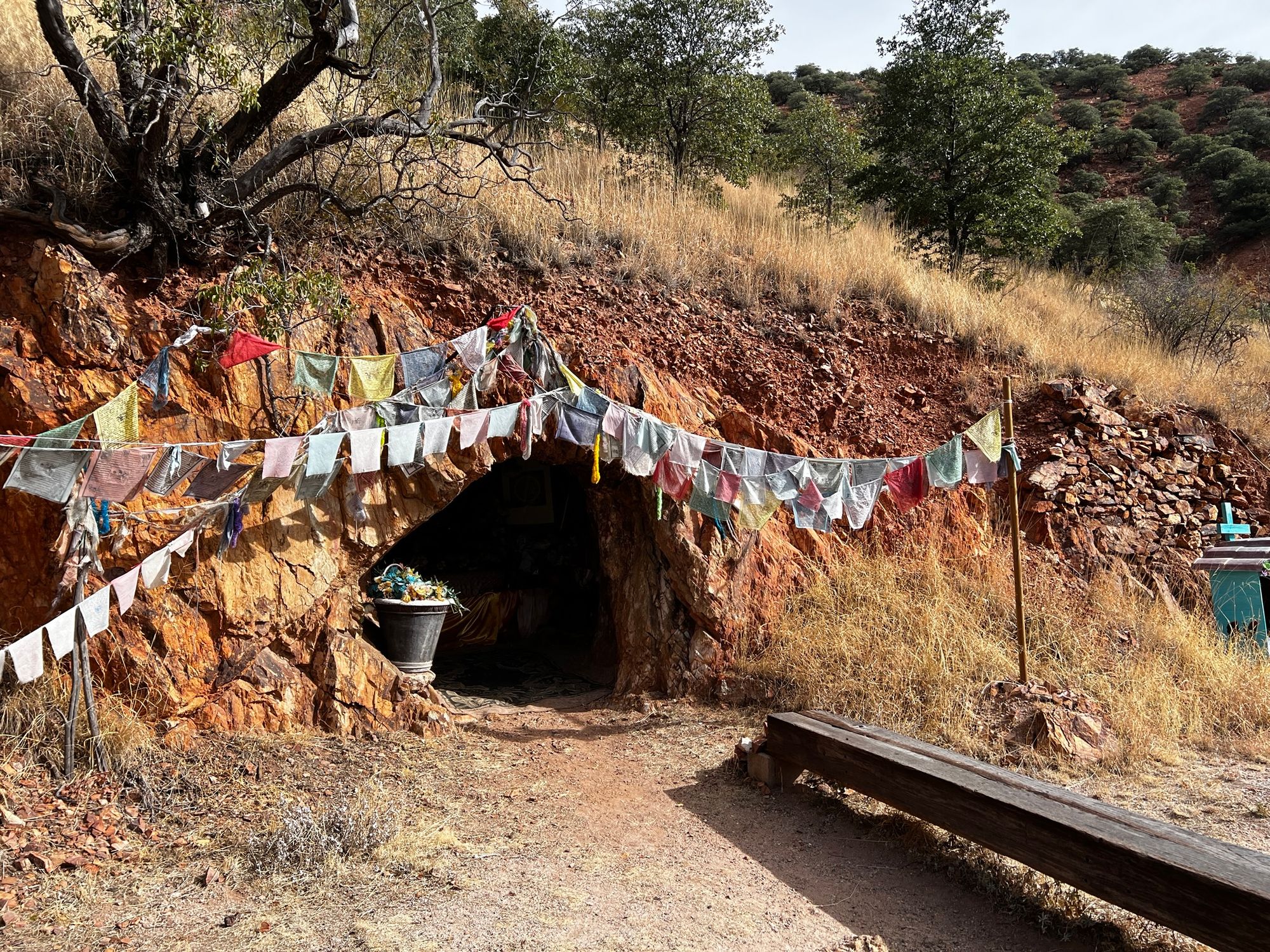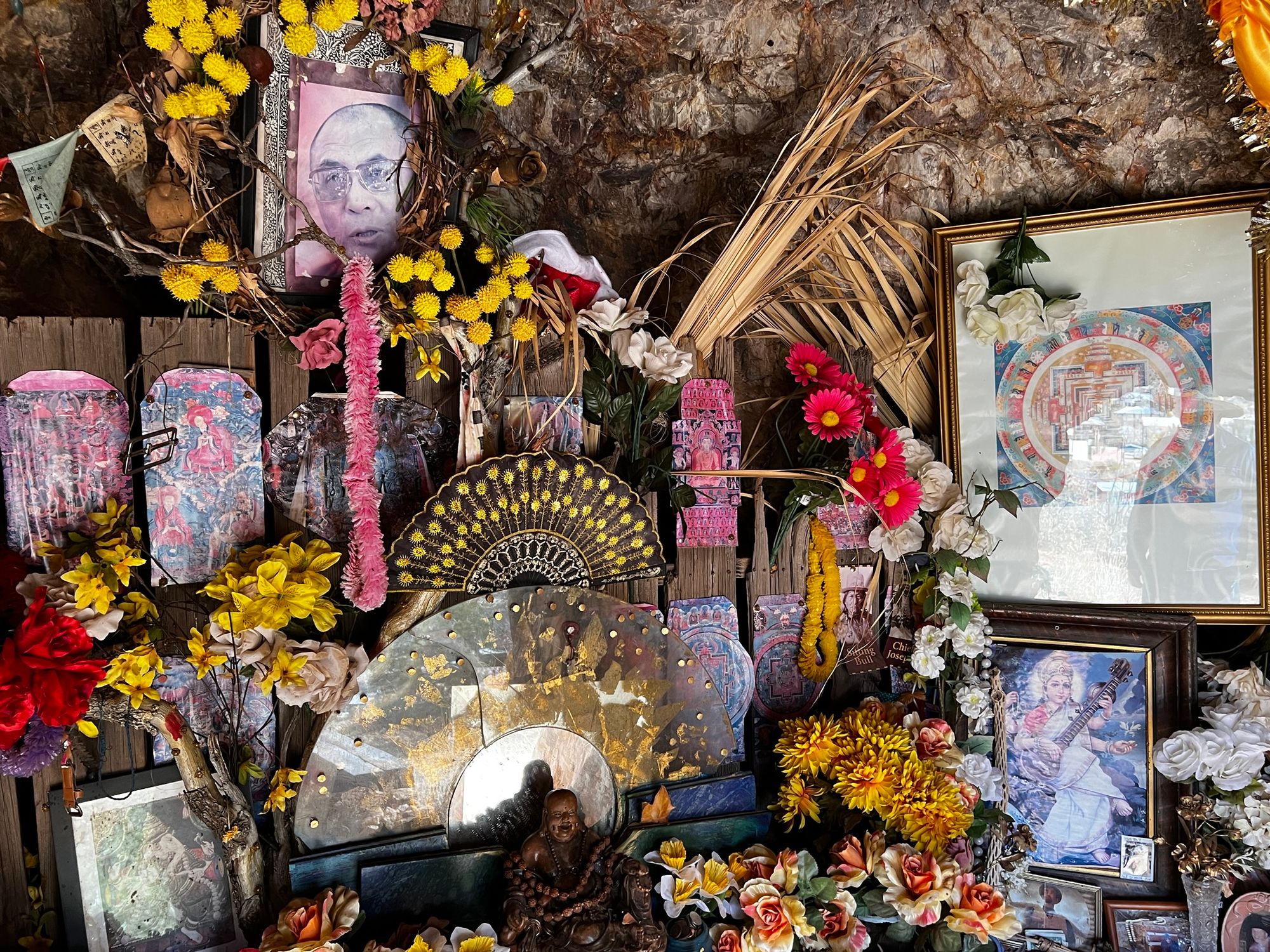 The next day, Mike shows me around town and our first stop is the Buddhist shrine: a cave adorned with Tibetan prayer flags, pictures of the Dalai Lama and other trinkets. He tells me that Art, a man in his early eighties who lives nearby, built it. Apparently, Art has also willed his land to a local Buddhist monastery after he passes. The steps up to the hill to the shrine are painted in bright orange colors, like some kind of path of enlightenment one might find in the Himalayas.