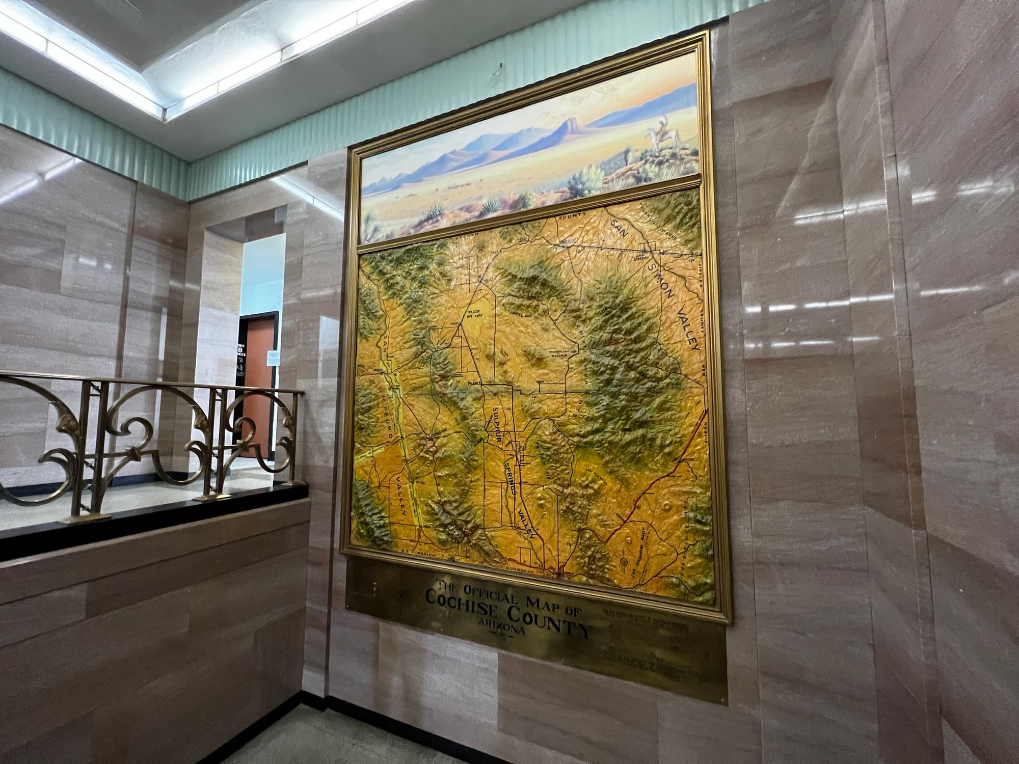 A couple days before Christmas, Mike and I walk into the Cochise County courthouse, a beautiful Art Deco with an adobe kind of flare that some call "Pueblo Deco." A lady outside recommends we go in and see the map. The map, which is a plaster three-dimensional representation of Cochise County, sits halfway up the stairs. Turns out George Sellers made it.