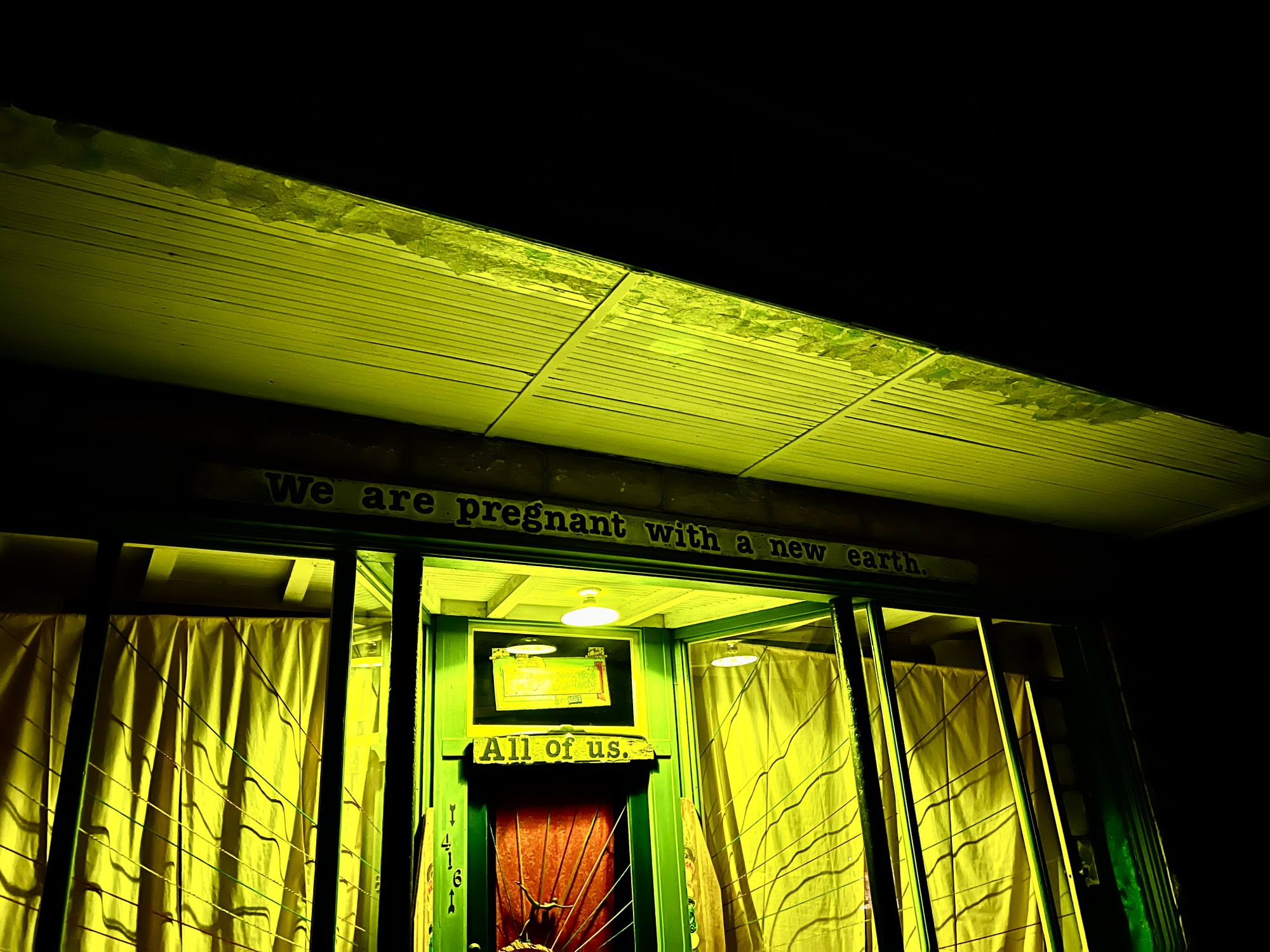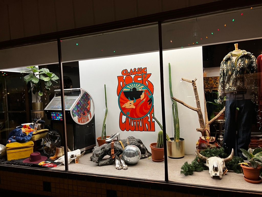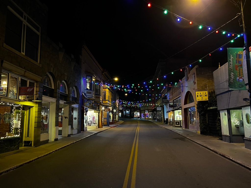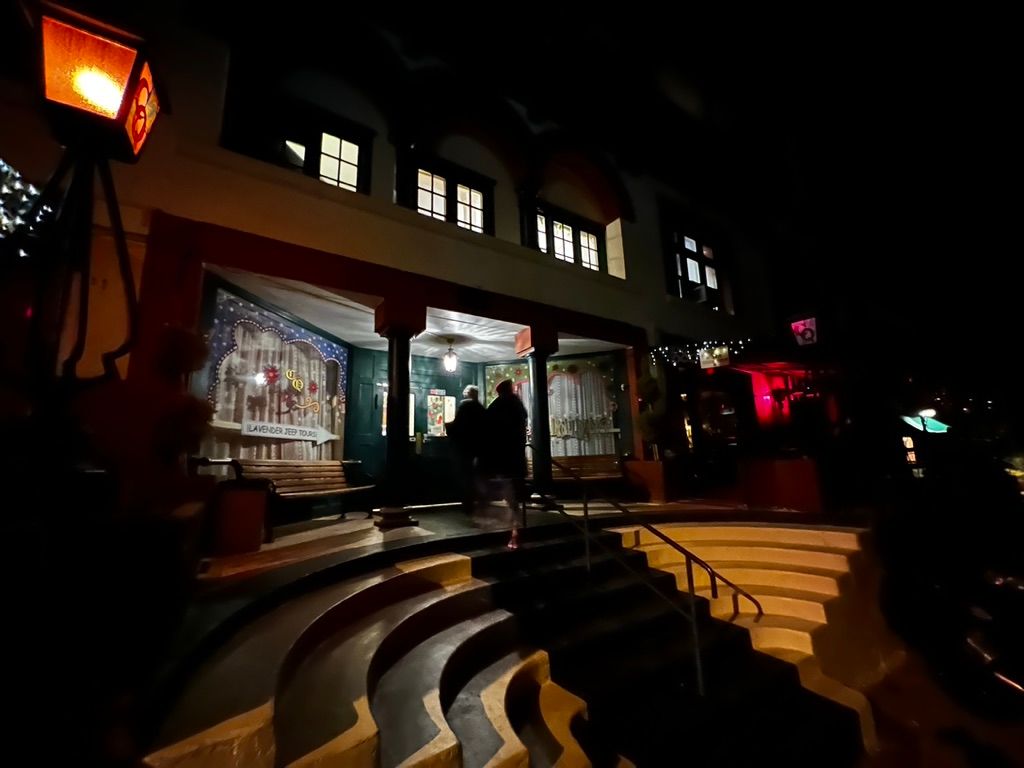 We exit the hotel and proceed to the main drag, which is adorned with charming lights zig-zagging the road. All of the shop windows are illuminated and full of unconventional stuff. Our stroll is very pleasant and quiet until we come up on the The Bisbee Grand, which has live music going. I think they're playing a cover of American Girl by Tom Petty. There's a homeless guy outside walking back and forth and belting along with the band's voices, but adding syncopated rap lyrics in between the verses. As we get closer, we see the singing-rapping guy yelling obscenities and harassing some other passersby, so we cross the street and he doesn't notice us.