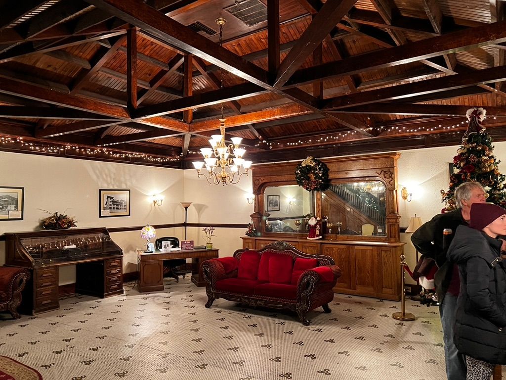 The night of Christmas Eve, we tour the city to see the lights. We stop into the Copper Queen Hotel (built in 1902) and the girl at the front desk, who has a tattooed face, beckons us inside to have a look around and see the architecture. It's gorgeously appointed. I really have the impression that "they don't build 'em like this anymore." It's absolutely haunted I am assured. The hallways sure seem like it. They're dimly-lit and extend to a vanishing point like something out of The Shining. The carpet is worn and stained. The door knob slides out of its socket when we try to go out on the balcony.
