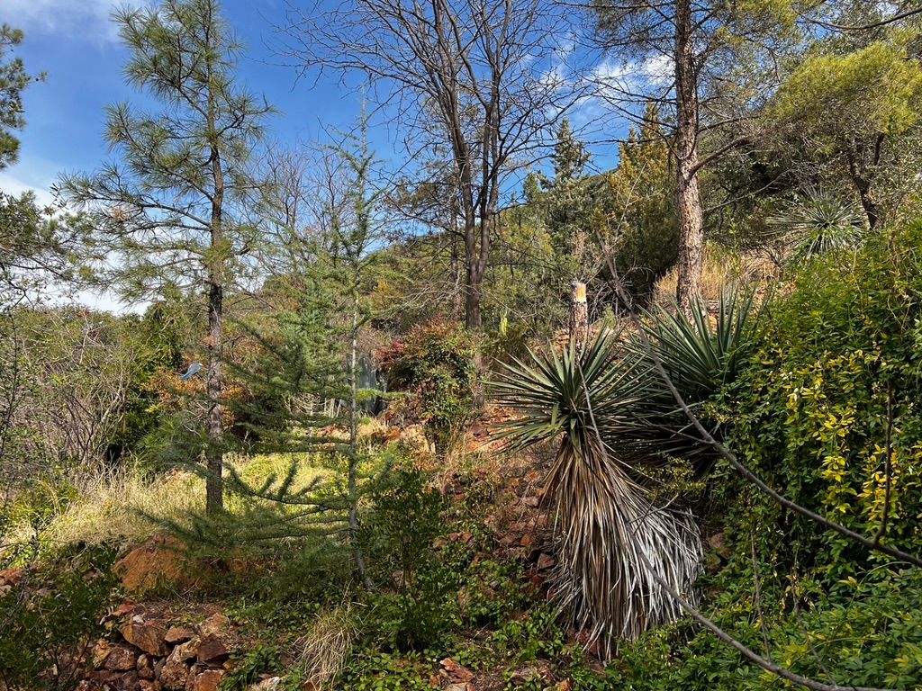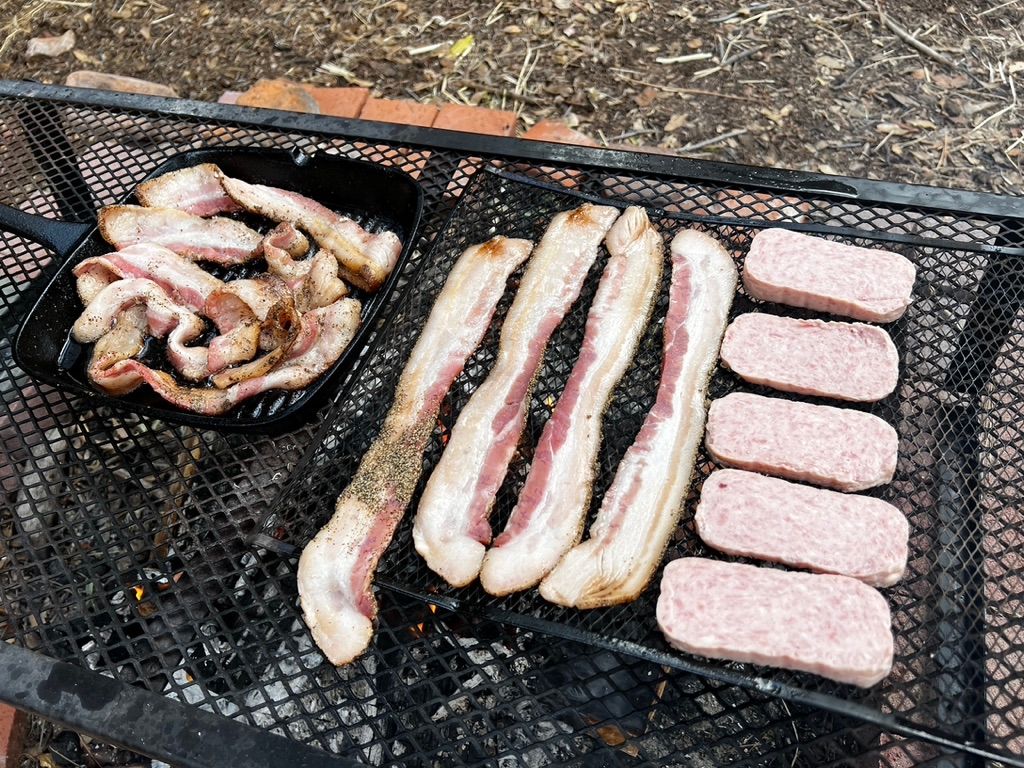 Christmas morning in Bisbee is lovely. Mike and Joanne go out before Fiona and I wake up and light a fire in one of the two hangout sites they've built in their backyard which extends far up the red-rock mountain. We join them at their spot and start a big cookout, complete with percolated coffee, bacon, charbroiled spam (which I would not recommend), and french toast from the cast iron. It's delicious and cozy. While listening to carols, we feed peanuts to the birds, who swoop down from their perches on giant agaves and other desert vegetation.