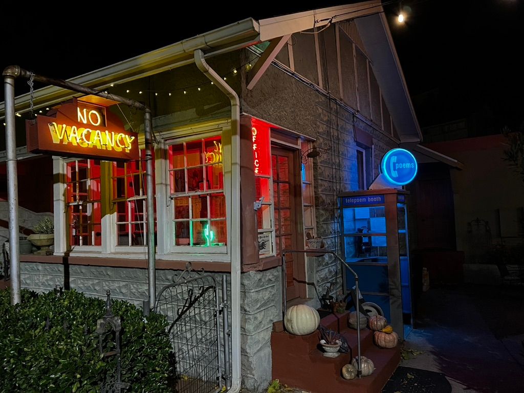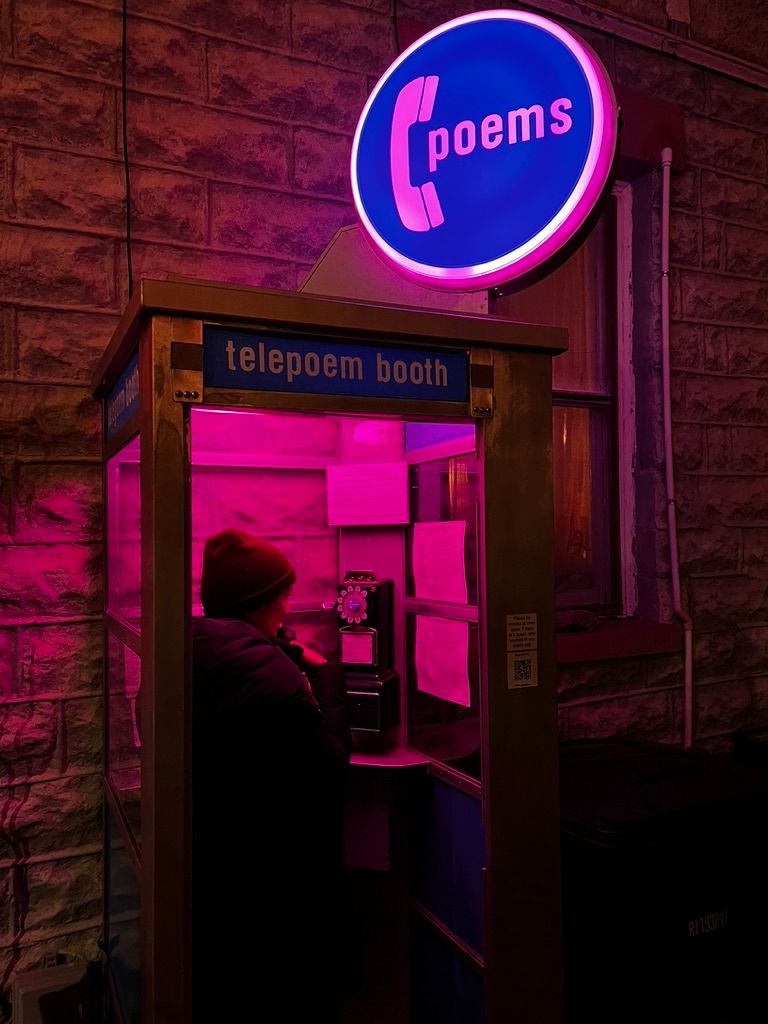 The Jonquin Motel has a phone booth outside with a big, circular sign on top that reads "Poems." It alternates fluorescent colors. Upon inspection, we see that the phone inside lets you dial a specific set of numbers for poetry readings. A placard inside provides a legend for which number gets you which poem. Betsy, Fiona's aunt, has various poems listed next to the numbers and we try a few out. Unfortunately, none of them seemed to connect. We get a bit bummed out by this.